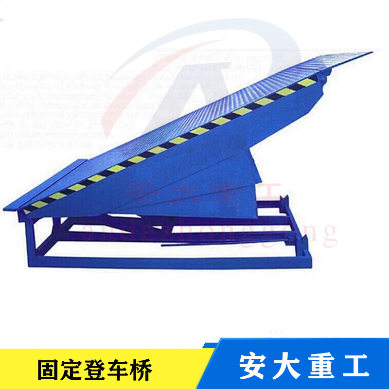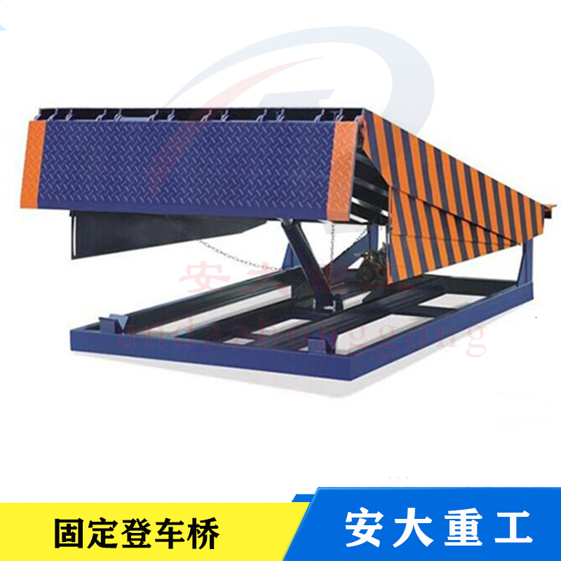 固定液壓登車橋式實現貨物快速裝的專用輔助設備,他的高度調節功能使貨車與庫房的貨臺之間架起一座橋梁,叉車等搬運車輛通過它能直接駛入貨車內部進行貨物的批量裝卸。