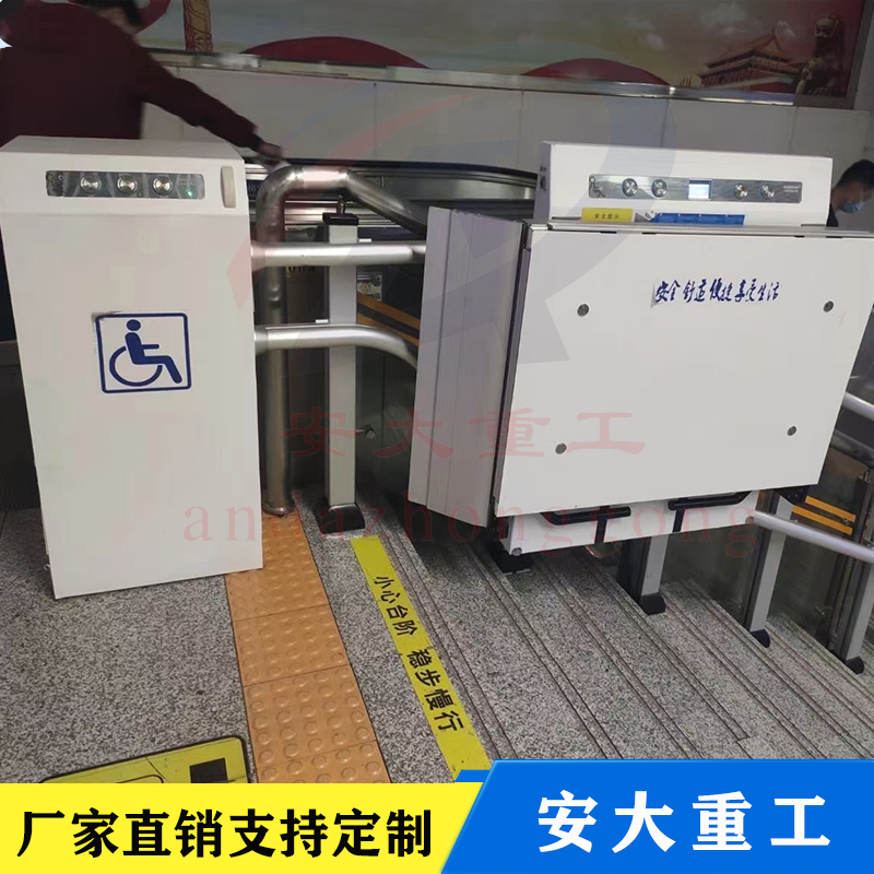 斜掛式無障礙升降平合按其運行方向分曲線型和直線型二種。直線型多采用齒輪齒條式驅動機構,沿樓梯做上升和下降,只能作直線運行不能轉彎,傾斜角一般不大于35度,適用于樓層較低、中間沒有水平段的直線型樓梯。曲線型采用繩球鏈式傳動,不僅能做上升和下降,還能水平、轉彎和螺旋形運行,適用范圍較為廣。該設備為乘坐輪椅的殘障人員上下樓梯提供了便利,現被廣乏地應用在家居住宅和公共場所的樓梯上